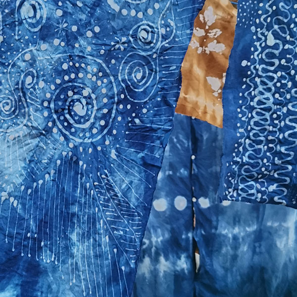 We will use Japanese Shibori techniques, and batik to create resists and introduce a little contrast with Potassium Permanganate brown.